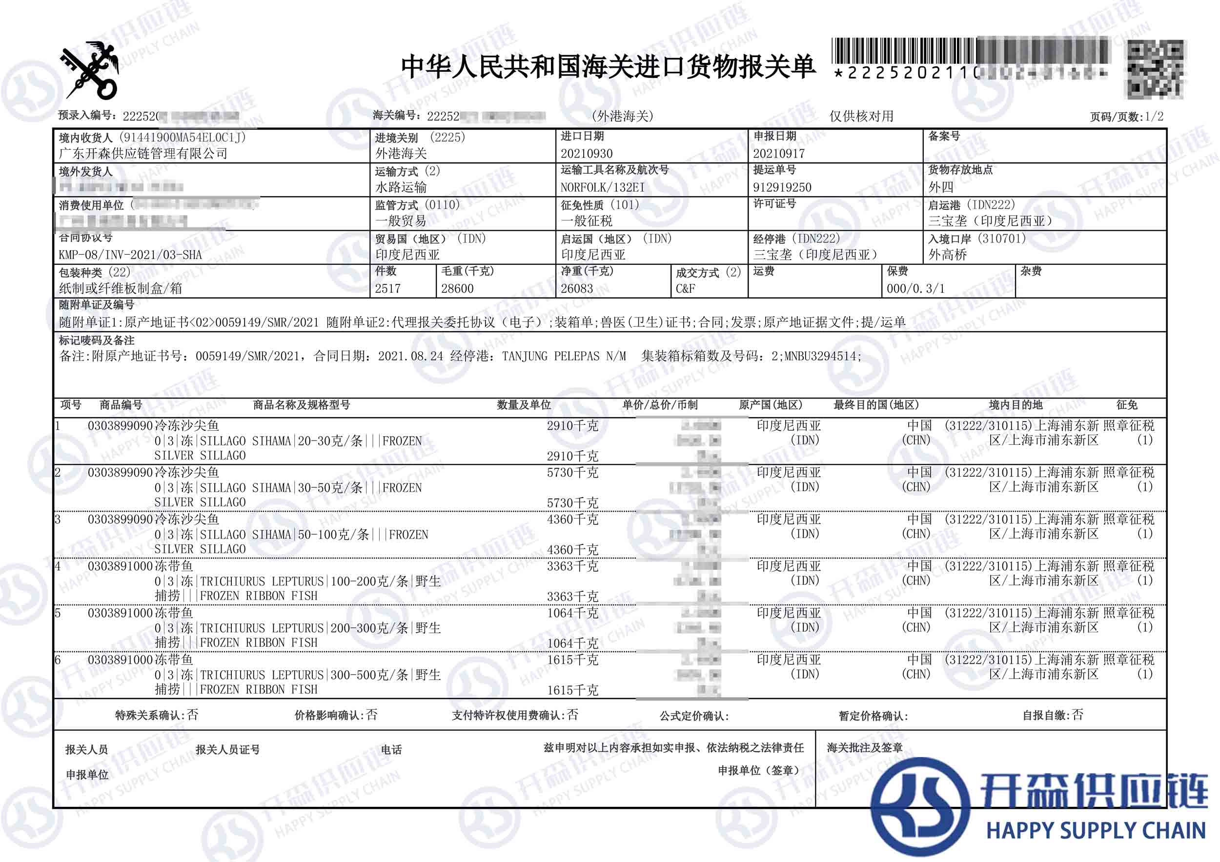【本文結語】 上述就是印度尼西亞冷凍沙尖魚進口報關代理服務【經(jīng)典案例】的全部內容,希望能對您有所幫助,如有水產(chǎn)品進口報關上任何疑問及問題可隨時在線聯(lián)系我們或撥打 18002611553,開森供應鏈擁有豐富的水產(chǎn)品進口報關操作經(jīng)驗及案例,10余年進口經(jīng)驗為您所用,各類進口疑難都能為您一一解答及協(xié)助快速處理解決!