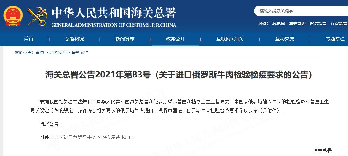 2021年10月18日,海關(guān)總署發(fā)布2021年第83號公告:允許符合相關(guān)要求的俄羅斯牛肉進(jìn)口,詳情如下: