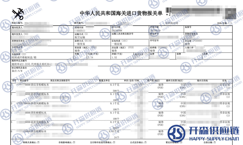 【本文結語】 上述就是秘魯蝴蝶標本進口報關清關代理服務【經典案例】的全部內容,希望能對您有所幫助,如有蝴蝶標本進口報關上任何疑問及問題可隨時在線聯系我們或撥打 18002611553,開森供應鏈擁有豐富的蝴蝶標本進口報關操作經驗及案例,10余年進口經驗為您所用,各類進口疑難都能為您一一解答及協助快速處理解決!