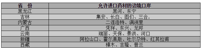 黑龍江省黑河、東寧,吉林省集安、長(zhǎng)白、圖們、三合,內(nèi)蒙古自治區(qū)二連浩特、滿洲里,廣西壯族自治區(qū)憑祥、東興、龍邦,云南省瑞麗、天保、景洪、河口,新疆維吾爾自治區(qū)阿拉山口、霍爾果斯、吐?tīng)栨靥亍⒓t其拉甫,西藏自治區(qū)樟木、吉隆、普蘭等共22個(gè)邊境口岸作為中藥材進(jìn)口通關(guān)口岸。