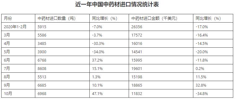 2020年1-10月中國中藥材進(jìn)口數(shù)量為53428噸,增幅為3.3%;進(jìn)口金額為155981千美元,降幅為10%;2020年1-10月中國中藥材進(jìn)口均價(jià)為2.92千美元/噸。